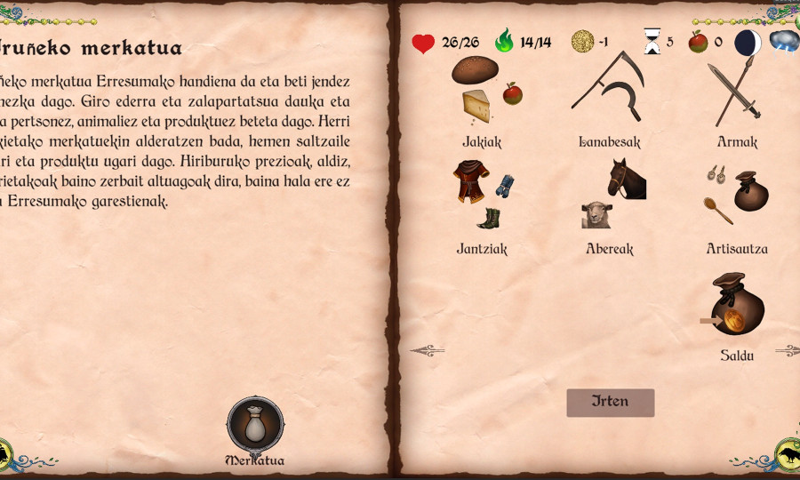 Bideojokoa gutxienez Windows-erako kaleratuko da, eta lortzen den aurrekontuaren arabera Linux-erako (beraz Steamdeck-erako) eta Android-erako bertsioak ere prestatuko dira (telefono mugikorrak eta tablet-ak). Bideojokoa bakarka jolasten da eta bertan hainbat istorio, gertaera, abentura eta erronka aurkezten zaizkio jokalariari. Horretarako, irudiak eta testua erabiltzen dira leku eta erronken deskribapenetan. Kolorezko irudi ugari dago hiribilduak irudikatzeko, merkatuetan eta pertsonaiaren fitxan aurki daitezkeen objektuak erakusteko, eta baita borroketako aurkariak, atzealdeak eta mapa azaltzeko orduan.